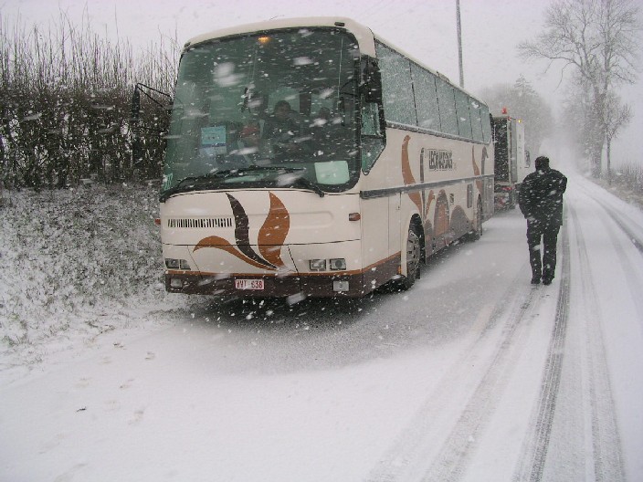 Na een tijdje begon het licht te worden. Er scheen een mooi zonnetje en een mooi landschap werd zichtbaar.We kregen bericht dat de vervangbus door een sneeuwstorm vertraging zou oplopen en momenteel zich in Verviers bevond. Gelukkig kwam daar de vrachtwagen met de vervangwaterpomp toe. Zodat die al aan de bus kon werken om de panne te herstellen. Enkele mensen zagen in de verte een mistbank rijzen. Maar we ontdekten al snel dat er een sneeuwmuur op ons afkwam. En dachten aan die goede oude wet van Murphy.